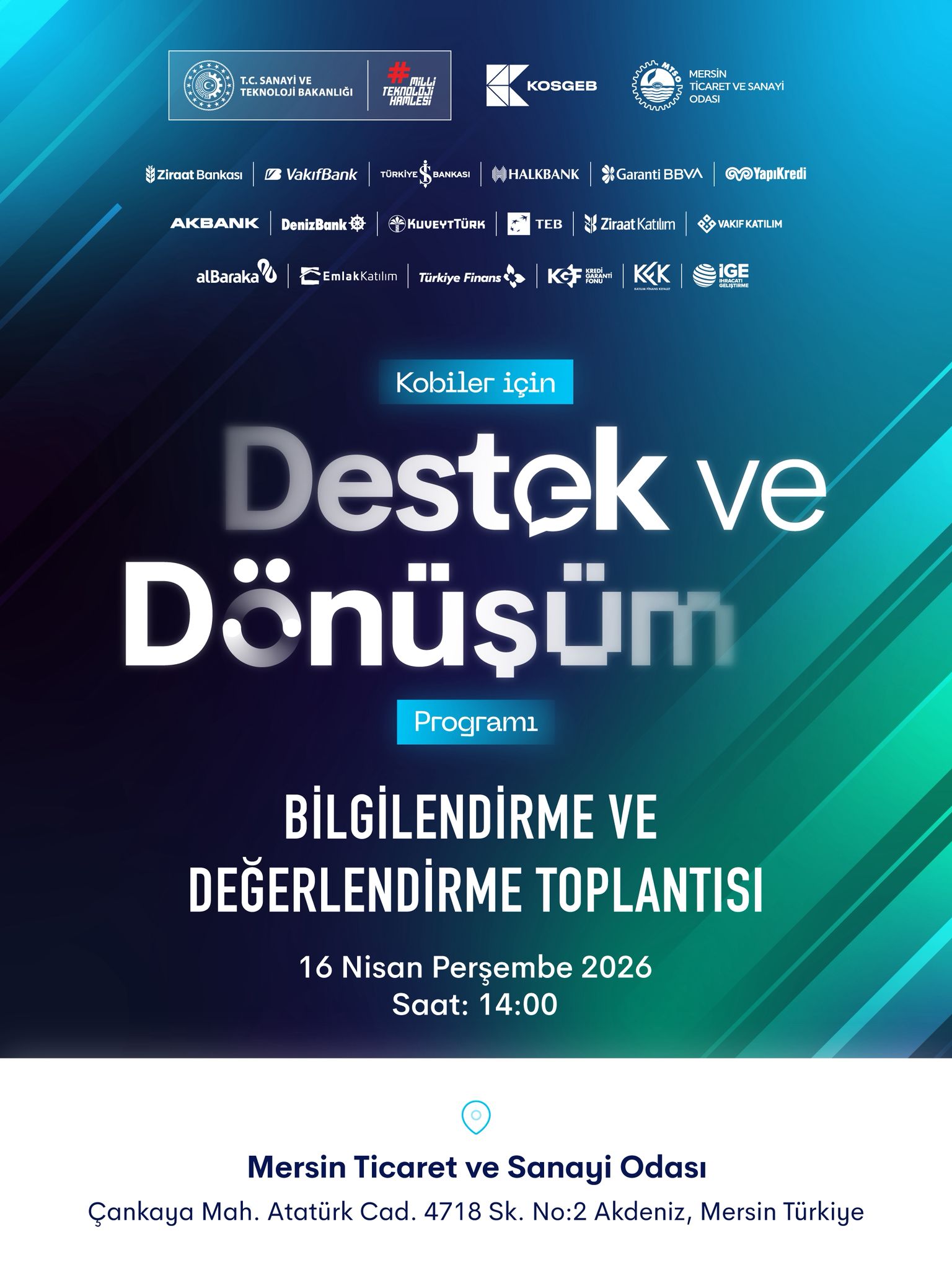 Mersin Ticaret ve Sanayi Odası ev sahipliğinde, KOSGEB tarafından işletmelerimizin üretim sürekliliğini, istihdam kapasitesini ve sürdürülebilir büyümesini desteklemek amacıyla "Destek ve Dönüşüm" temalı bir bilgilendirme ve değerlendirme toplantısı düzenlenecektir.