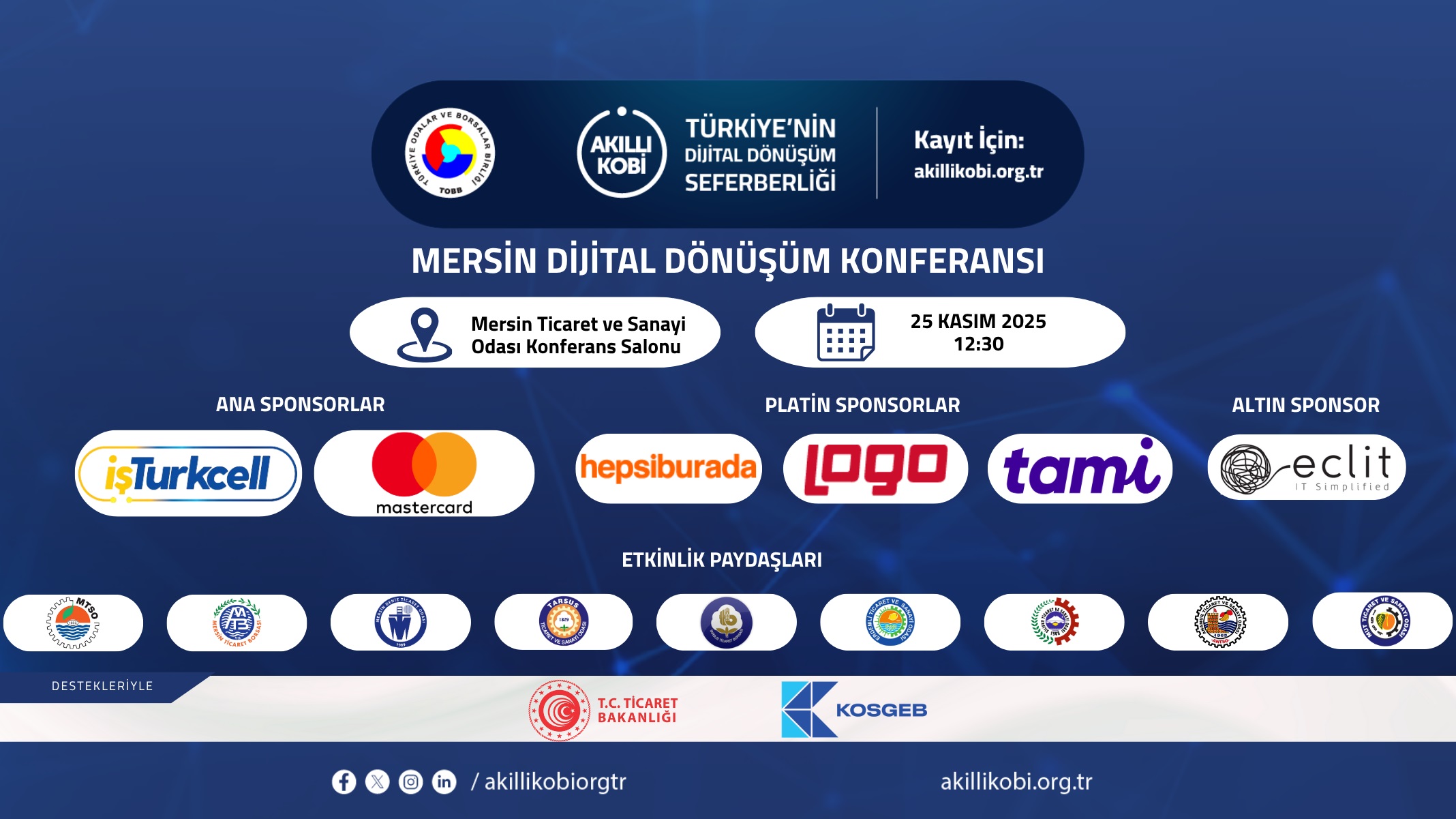 KOBİ'lerin dijitalleşme süreçlerine rehberlik etmek ve dijital dönüşümünü hızlandırmak amacıyla oluşturulan Akıllı KOBİ Platformu kapsamında 25 Kasım 2025 Salı günü saat 13:00’da Odamız hizmet binasında “Mersin Dijital Dönüşüm Konferansı” düzenlenecektir.